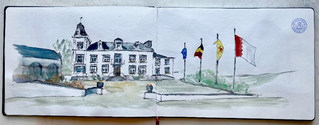 ![]() Michel - Peint depuis la rue, face à la Mairie (ici on dit "maison communale") Aquarelle sur carnet Moleskine (paysage) 2xA4 |